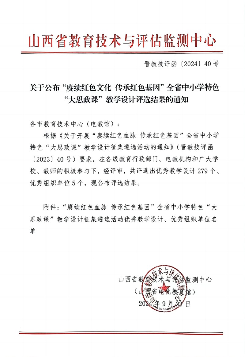 关于公布“赓续红色文化 传承红色基因“全省中小学特色“大思政课”教学设计评选结果的通知